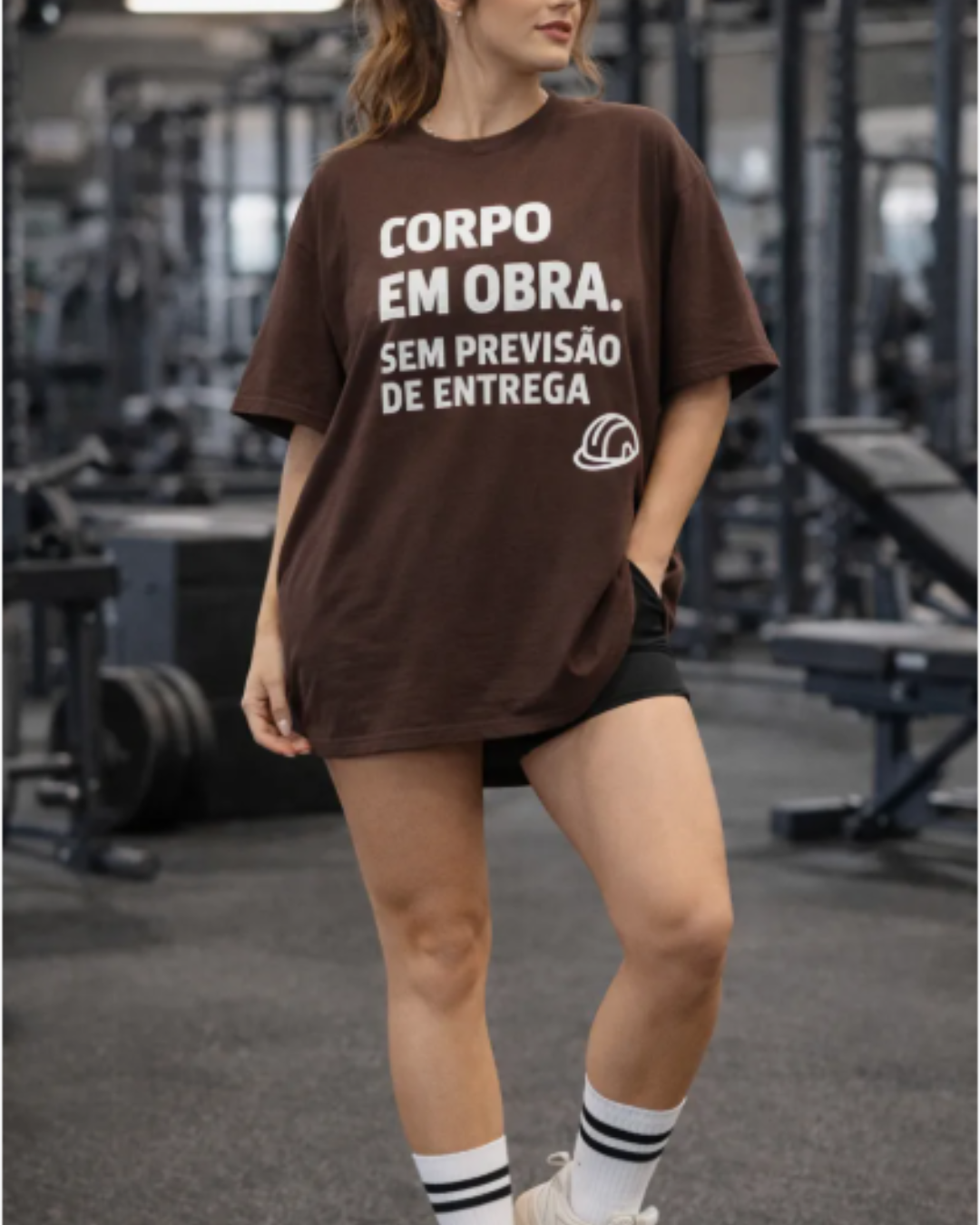 Modelo 100% algodão. Estampa em serigrafia Frase: "Corpo em obras, sem previsão de entrega". Conforto,humor e estilo para o seu treino. Disponível em breve!